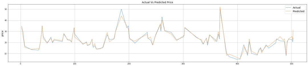 plot_df = big_test_prediction_df.sort_index(plt.figure(figsize=(30,6))plt.plot(plot_df['PRICE'],  linewidth=1, label= 'Actual') plt.plot(plot_df['prediction_results'], linewidth=1, label= 'Predicted')  plt.ylabel('price', fontsize=14)plt.legend(fontsize=14,loc='upper right')plt.title('Actual Vs Predicted Price', fontsize=14)plt.grid()plt.show()