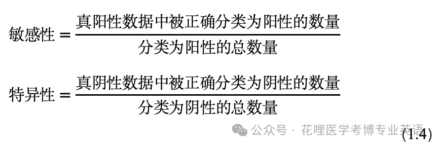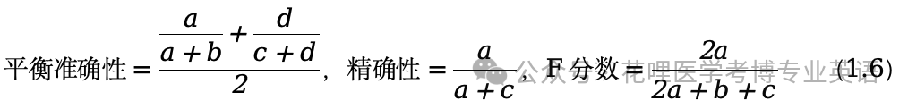 除了等式(1.5)中的度量外,还可以使用混淆矩阵计算许多其他分类度量指标,其中平衡准确性、精确性和F分数(定义如下)在文献中使用更加频繁。