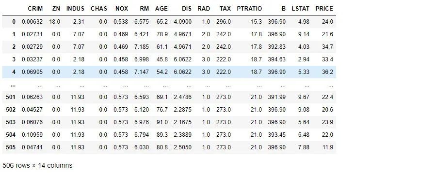 # 加载数据并转换成dataframeboston_dataset = load_boston()target = boston_dataset['target'].reshape(506,1)boston_df = pd.DataFrame(np.hstack((boston_dataset['data'],target)),columns=np.append(boston_dataset['feature_names'],['PRICE']))boston_df
