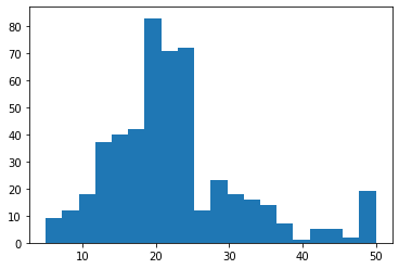 boston_X,boston_Y = load_boston(return_X_y=True)plt.figure()plt.hist(boston_Y,bins=20)plt.show()