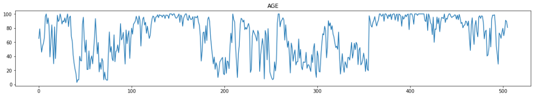 for i in range(0,boston_df.shape[1]):plt.figure(figsize=(20,3))plt.title(boston_df.columns[i])plt.plot(boston_df[boston_df.columns[i]])plt.show()