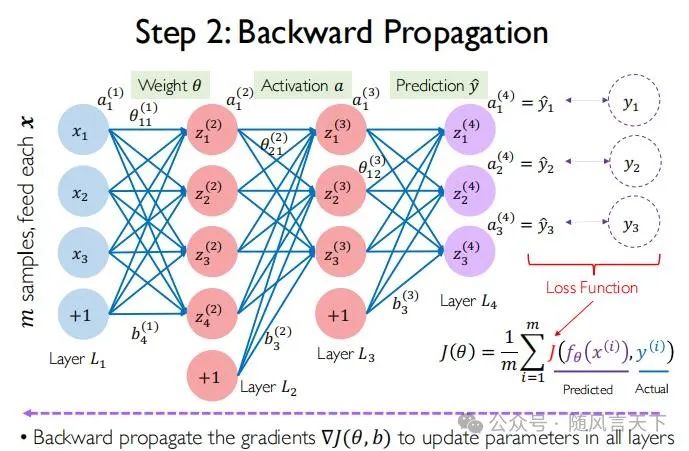 由于最初θ是未知的,故可先假设一个θ。前向传播可计算出所有的x、y、z以及a