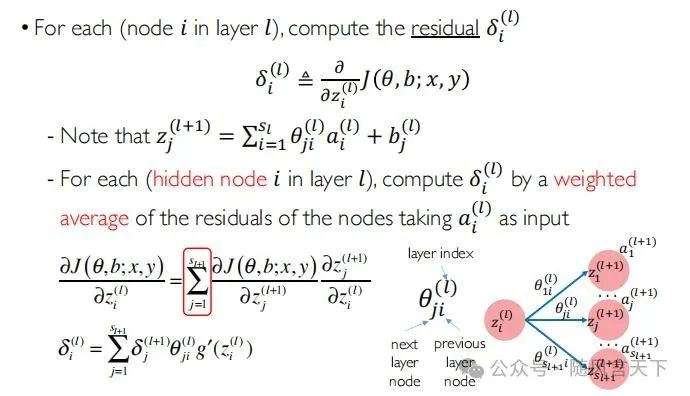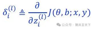 对于第l个隐藏层中第i个神经元,可通过下式来计算其残差,即目标函数对其进行求导: