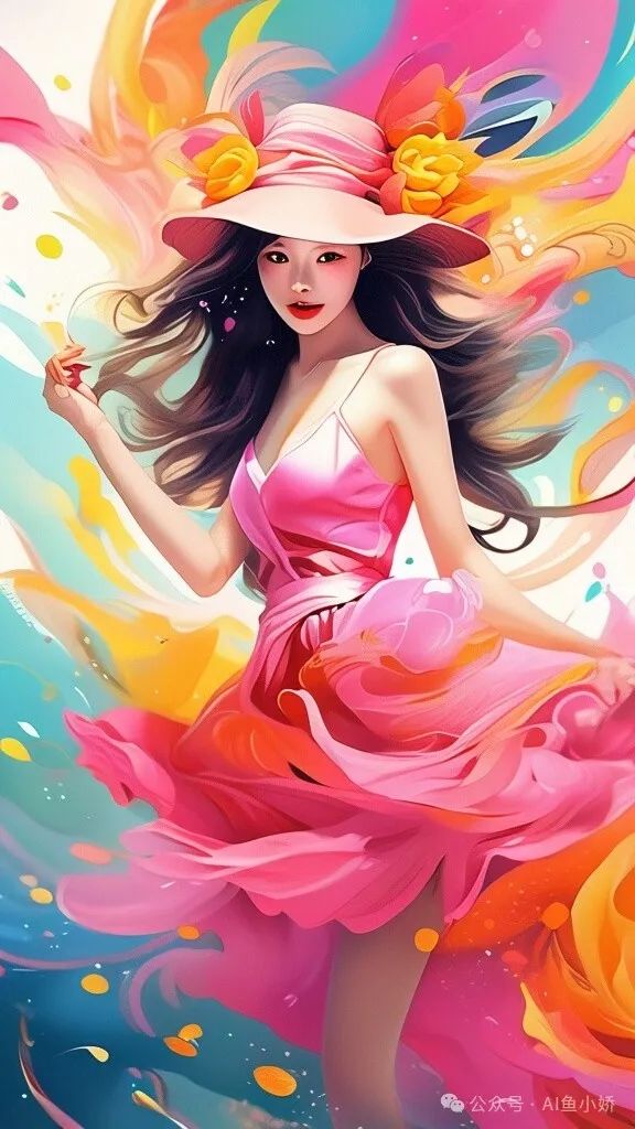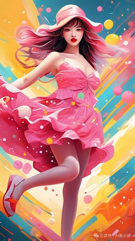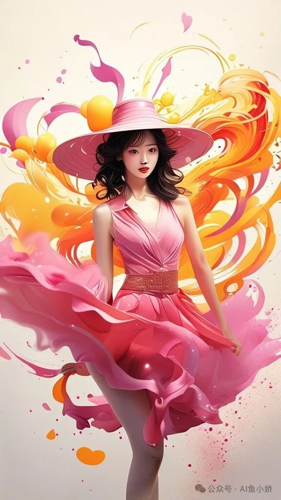 提示词:生成一幅充满活力和动感的插画。画面中央是一位身穿粉色服装的女性角色,她戴着帽子,头发飘逸,正在做着一个舞蹈动作。角色周围环绕着粉色和黄色的液体飞溅效果,这些色彩鲜艳的颜料仿佛被瞬间冻结在空中。背景部分模糊不清,只隐约可见一些建筑轮廓。
