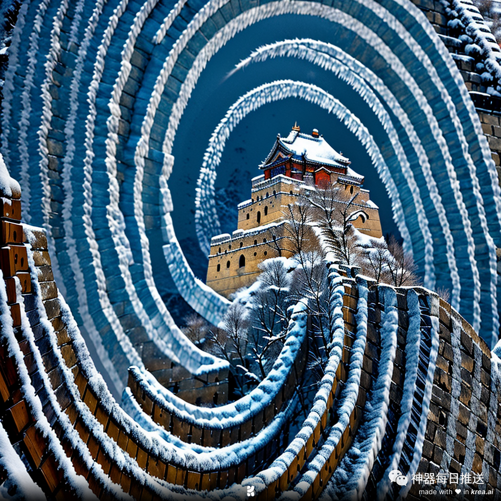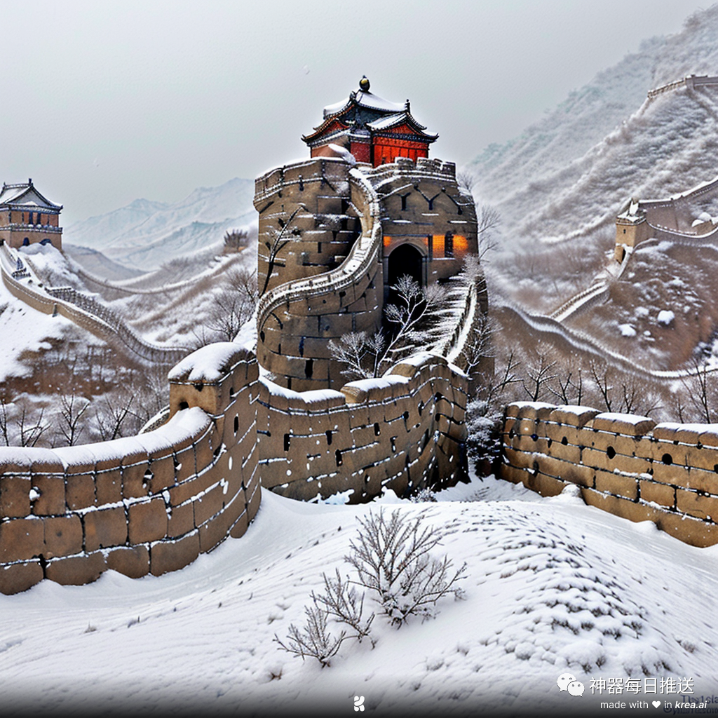 Snow-covered Great Wall of China with intricate details of snowflakes falling gently against the ancient fortification, capturing the serene and peaceful atmosphere of a winter's day in the mountains.