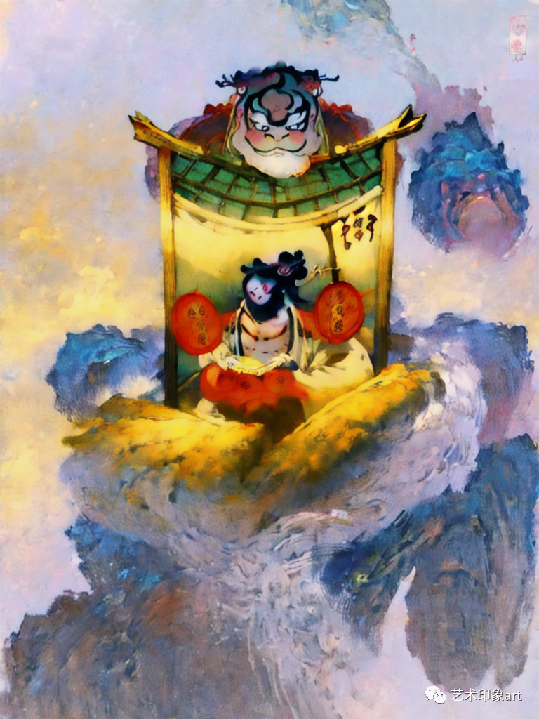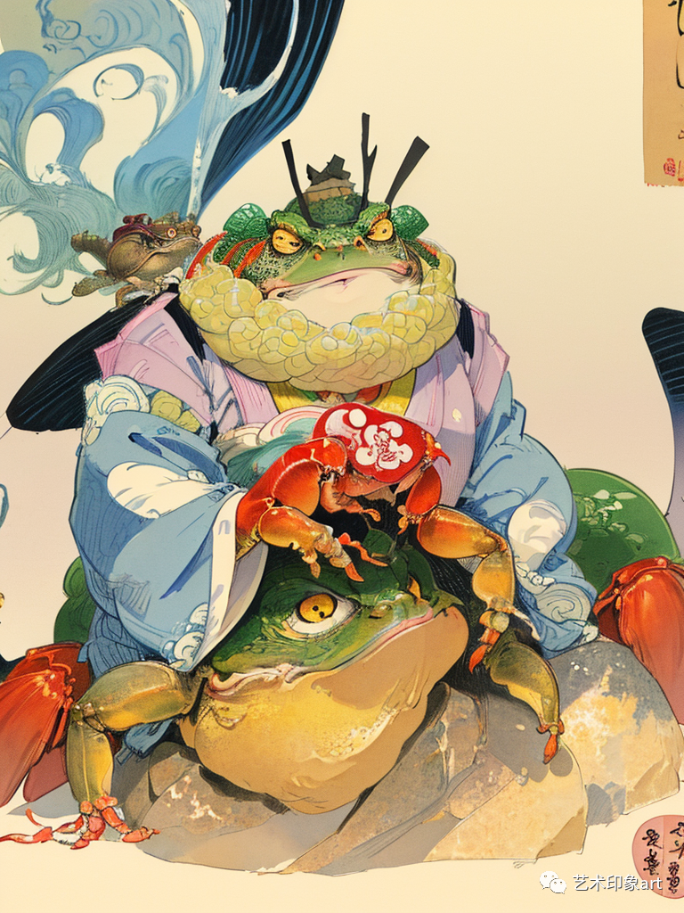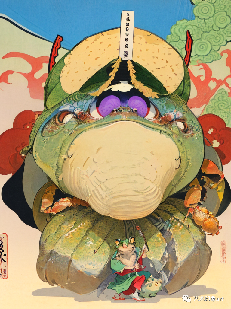在这类AI生成的幻想插画中,我们看到了一个个奇幻的世界。其中,大乌龟、大金蛙、两只鸟等动物形象的出现,给人们带来了强烈的视觉冲击。这些动物形象不仅具有鲜明的个性和特点,还被赋予了丰富的情感和内涵。通过动物的形象,AI插画传达了一个个深邃的思考和感悟。