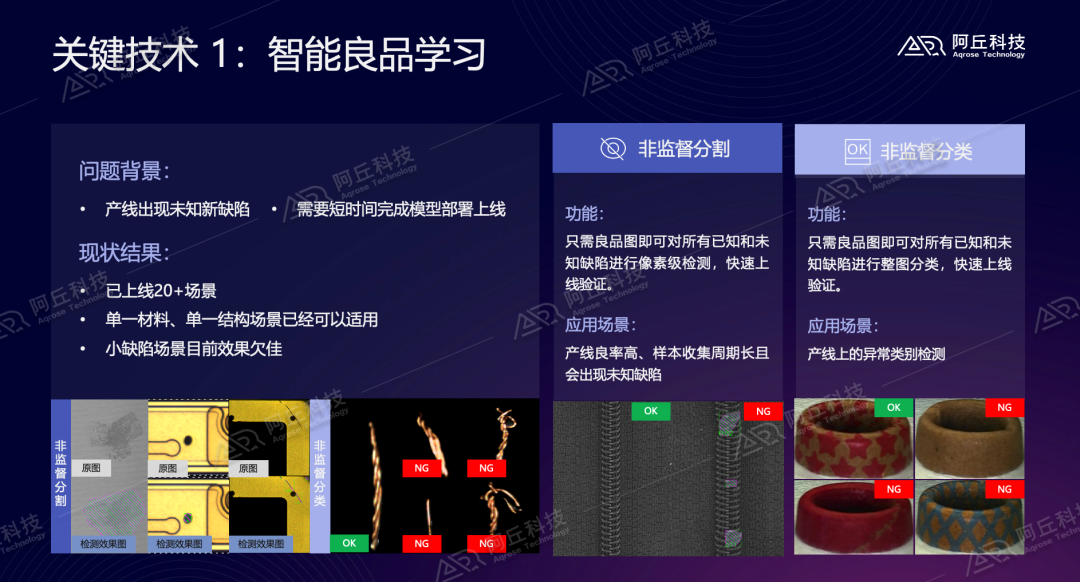 阿丘科技认为,工业AI视觉2.0时代的关键技术之一即智能良品学习,它包括非监督分割和非监督分类两种模块。这项技术可有效应对产线中出现的未知新缺陷,以及需要在极短的时间内完成模型部署和上线的问题。