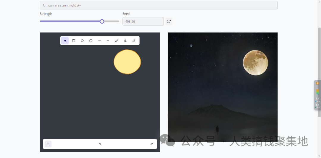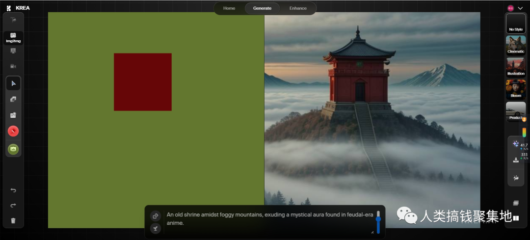 Leonardo的界面与Krea AI有些类似,用户可以利用画笔和图形工具进行创作,并且能够根据提示词的变化来调整画面内容。