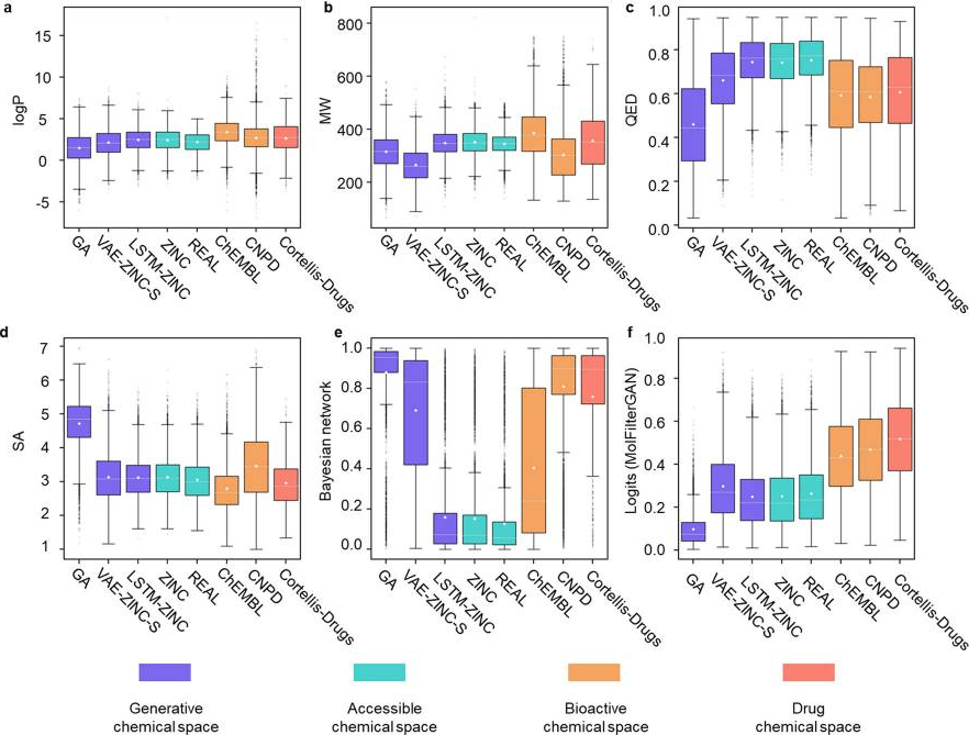 研究发现,大多数来自生物活性化学空间或药物化学空间的化合物符合RO5的规则,如图2a、b所示。但是RO5标准在其他基准集上表现不佳,因此在筛选候选药物时,RO5可能会出现过高的假阳性率。另外,作者发现QED的评分结果出现了误导性的趋势,其中ZINC和REAL分别获得了比ChEMBL、CNPD和Cortellis-Drugs更高的评分(如图2c、d所示),这意味着在一些商业化合物库用于药物筛选时,这些评价方法可能会适得其反。此外,BNN(AE+GCNN)能够很好地区分药物化学空间和可合成的化学空间,在生物活性库(ChEMBL、CNPD)的评分分布也符合预期(如图2e所示)。但是,当将其应用于过滤生成模型生成的分子时,BNN在生成库GA和VAE-ZINC-S也获得了高分,这意味着它可能有助于HTS或vHTS,但在过滤生成模型得到的分子时,可能会出现高误报率。