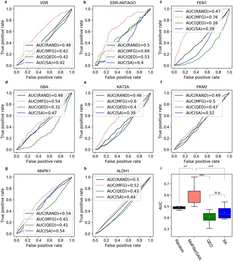 如图2e,MolFilterGAN模型在不同化学空间的基准数据集上表现出色,能够很好地区分药物或生物活性分子和可合成分子。相比其他方法,该模型在VAE-ZINC-S或GA的得分上有所降低,这表明MolFilterGAN能够过滤掉低质量的生成化合物,减少高假阳性率的问题。研究结果表明,MolFilterGAN在区分不同来源的化合物方面表现更好,适合评估受益于其稳健的判别能力的分子。