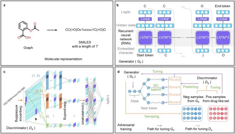 如图1所示,生成模型使用LSTM搭建,判别模型使用CNN模型搭建。对于生成器(Gθ),输入和输出都是 SMILES 字符串。对于鉴别器( Dφ),输入是一个 SMILES 字符串(分子),而输出的是鉴别器判定为来自“真实”样本的概率。此外,在用于测试之前,MolFilterGAN在大规模数据集上进行预训练。