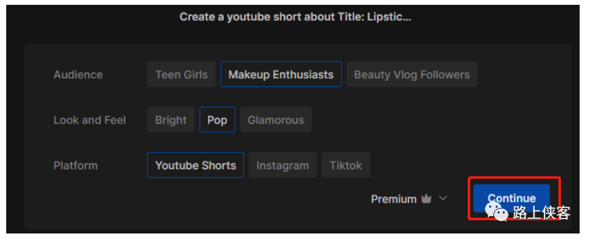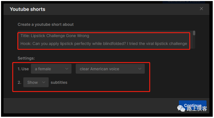 我们将视频文案和要求录入输入框,选择性别和语音之后点击Continue按钮。