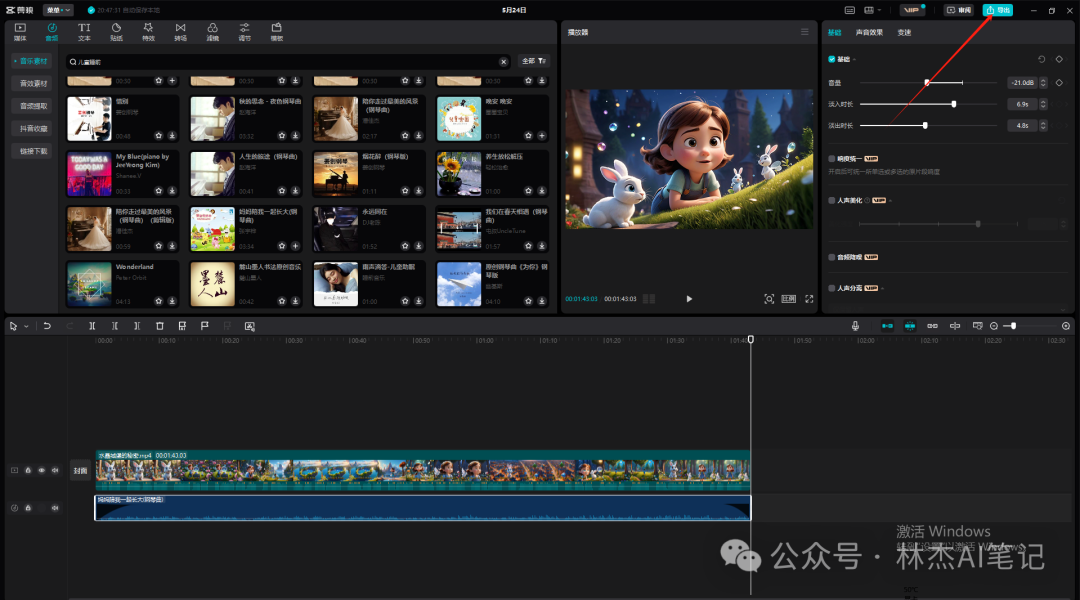 接着,我们点击右上角的“音乐”选项,选择一首符合儿童睡前故事文章氛围的背景音乐,并将选中的音乐拖入到文章轨道中。