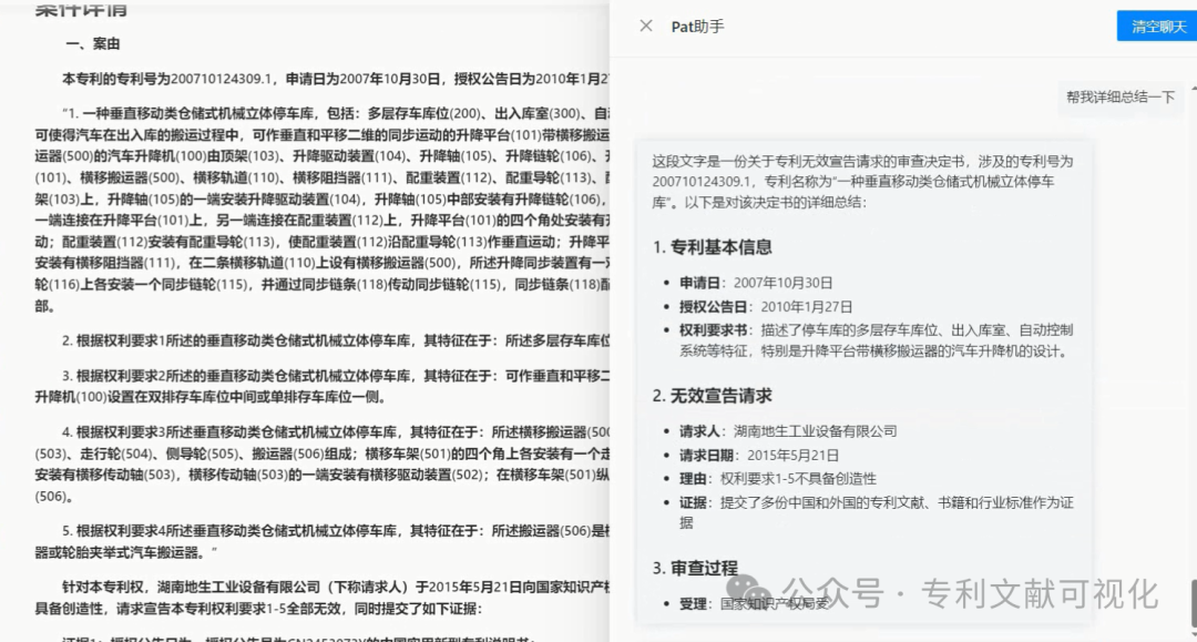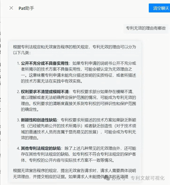 此外,我们引入了无效问答功能,这标志着我们向构建一个全面的知识产权专题知识库迈出了坚实的一步。通过这一功能,pat助手能够利用其先进的语言处理能力,为用户提供有关专利无效性的深入分析和解答。这不仅包括对现有法律框架的解读,还涉及对案例法的分析,以及对市场趋势的洞察。