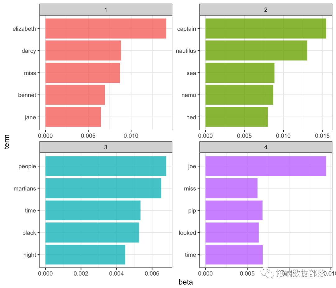 top_n(5, beta) %>%ungroup() %>%arrange(topic, -beta)top_terms# # A tibble: 20 × 3# topic term beta# <int> <chr> <dbl># 1 1 elizabeth 0.014107538# 2 1 darcy 0.008814258# 3 1 miss 0.008706741# 4 1 bennet 0.006947431# 5 1 jane 0.006497512