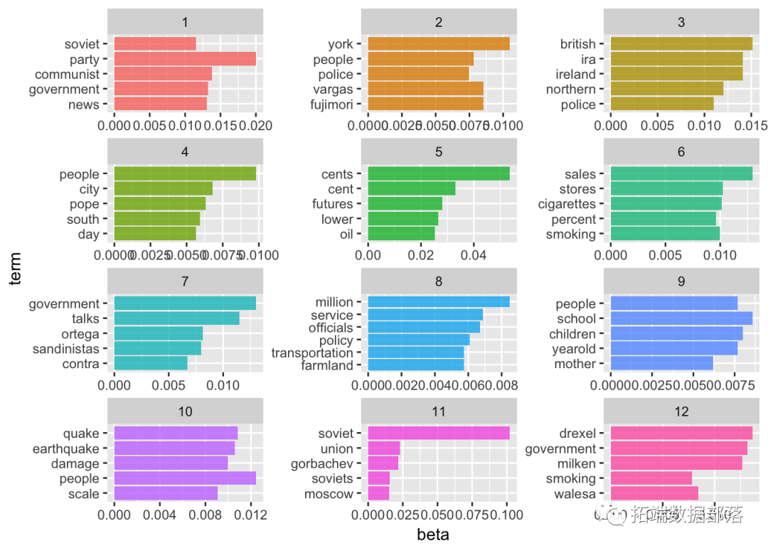 group_by(topic) %>%top_n(5, beta) %>%ungroup() %>%arrange(topic, -beta)top_terms## # A tibble: 20 × 3## topic term beta## <int> <chr> <dbl>## 1 1 soviet 0.009502197## 2 1 government 0.009198486## 3 1 president 0.007046753## 4 1 united 0.006507324## 5 1 people 0.005402784## 6 2 people 0.007454587## 7 2 police 0.006433472## 8 2 city 0.003996852## 9 2 time 0.003369658## 10 2 school 0.003058213## 11 3 court 0.006850723## 12 3 bush 0.006510244## 13 3 president 0.005777216## 14 3 federal 0.005512805## 15 3 house 0.004657550## 16 4 percent 0.023766679## 17 4 million 0.012489935## 18 4 billion 0.009864418## 19 4 market 0.008402463## 20 4 prices 0.006693626top_terms %>%) +coord_flip()