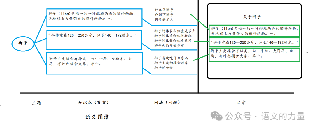 随着数据的不断增多,知识点可以逐步模板化。每个主题下面有多少个知识点变成了确定的东西。比如关于狮子的知识点有“狮子的定义”“狮子的习性”“狮子的特征”“狮子的体重”等等。把“狮子”换成“老虎”,知识点是一样多的。