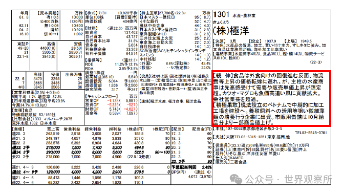 为了让大家更好地理解四季报的内容,我们来看一个具体的例子。图1展示了四季报的一页内容,具体为一家渔业公司——Kyokuyo Co. Ltd。圈出的部分表示专门用于收益和新信息的部分。尽管这些文本片段简短,但信息量极大。利用日语中的汉字表意特性,可以在简洁的形式中包含大量信息。例如,四季报中关于Kyokuyo的一段简短评论,就包含了对其业务表现的全面评估。