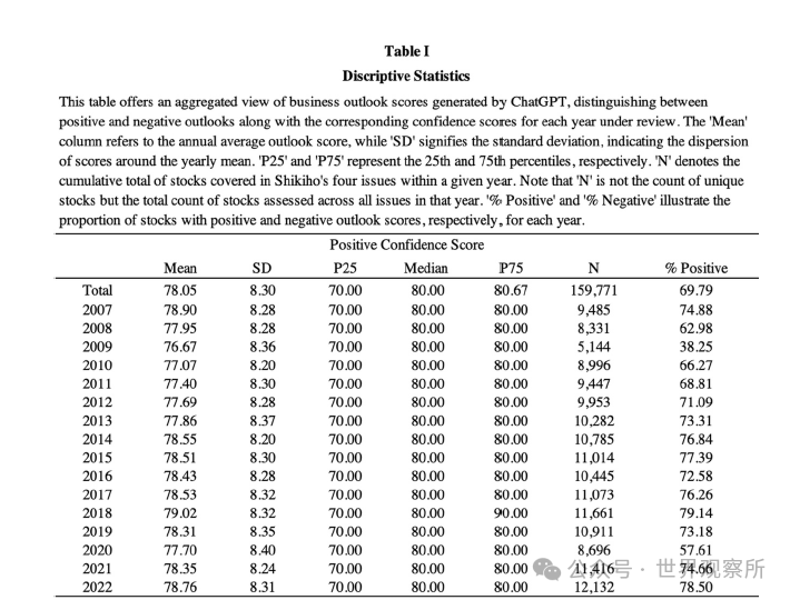 研究覆盖了2007年至2022年期间的四季报数据,总共64期。研究利用ChatGPT模型分析这些文本描述,并为每个公司分配一个判断分类及其对应的置信度评分。这些评分帮助判断某个公司前景是积极还是消极,并量化了判断的确信度。以下是一个具体的例子: