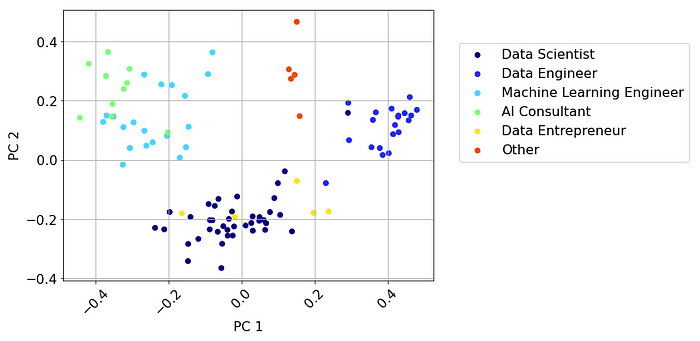 要查看数据集中的不同简历及其在概念空间中的相对位置,我们可以使用PCA]来降低嵌入向量的维度,并将数据可视化为二维图。