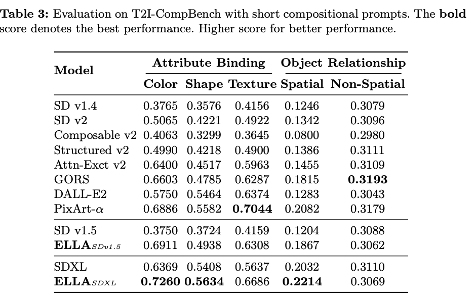 使用简短组合性提示在 T2I-CompBench 上的评估。加粗的分数表示最佳表现。分数越高表示表现越好。