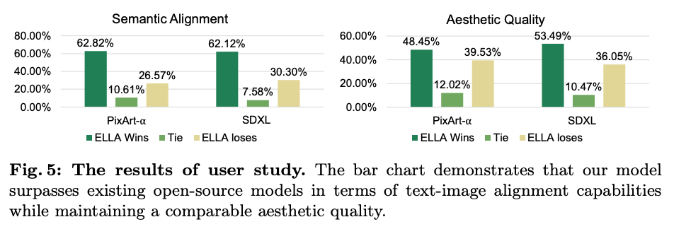 用户研究结果。条形图表明,ELLA模型在文本图像对齐能力方面超越了现有的开源模型,同时保持了可比的审美质量。