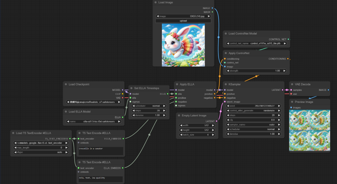 • 下载对应模型:1:模型ella-sd1.5-tsc-t5xl.safetensors放置到ComfyUI/models/ella/目录下。2:模型models--google--flan-t5-xl--text_encoder放置到ComfyUI/models/ella_encoder/目录下。模型可以通过文末网盘获取或在线链接下载。
