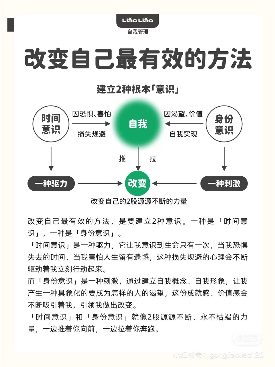 结合图片中的理论为我设计一个“改变自己助手”的prompt。这个prompt的设计核心是遵循图中的"""是要建立2种意识。一种是「时间意识」,一种是「身份意识」。"""