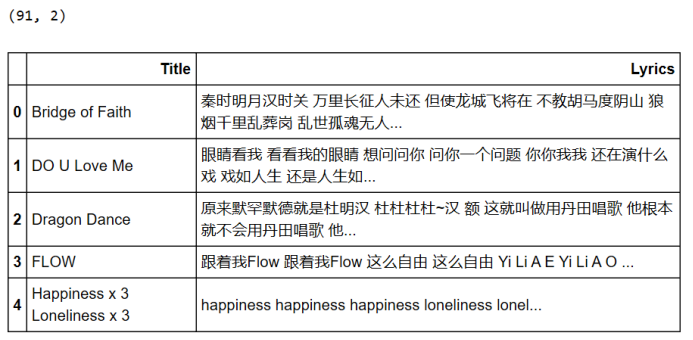 print(i, '\n', songs['Lyrics'][i])结果如下所示。
